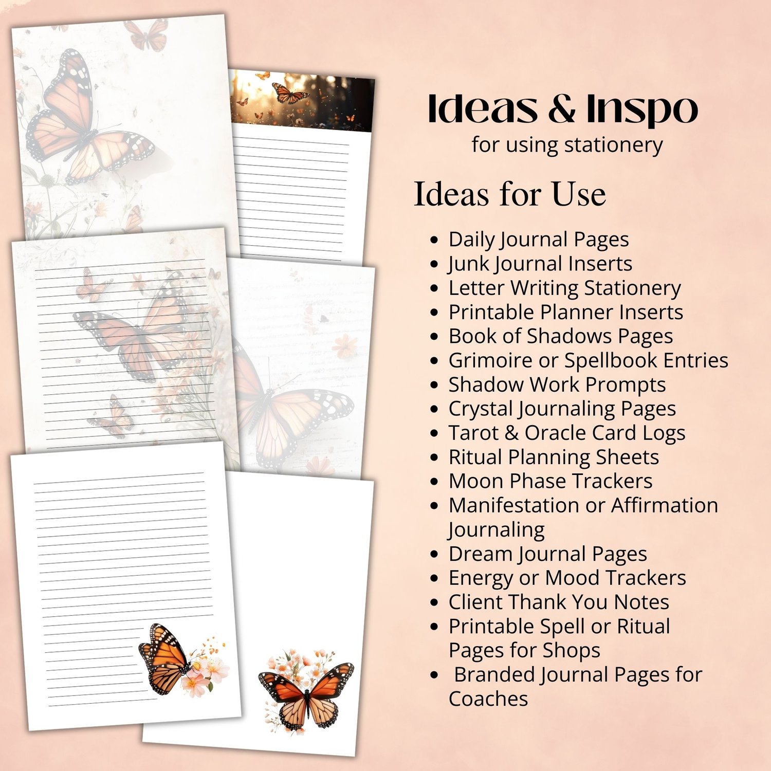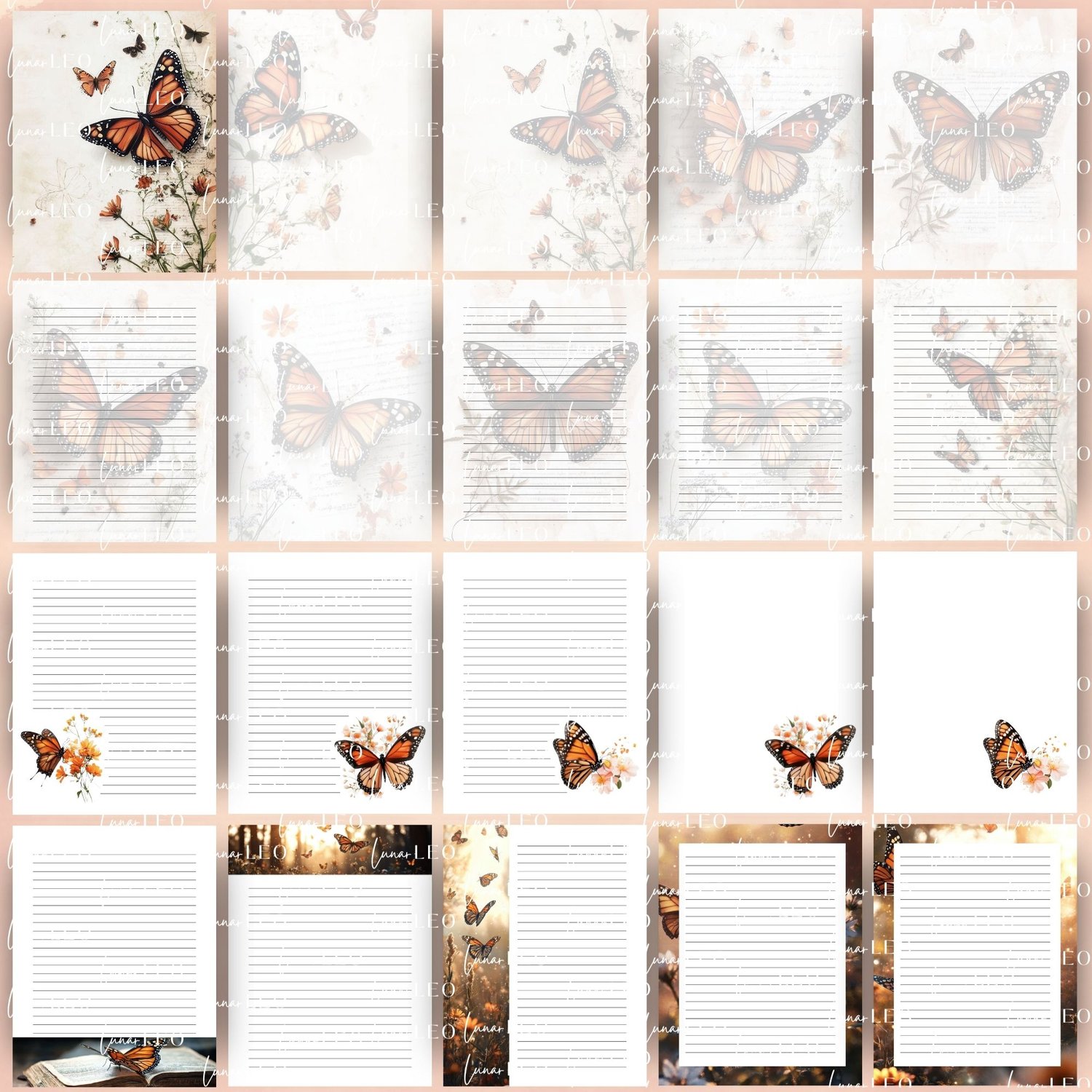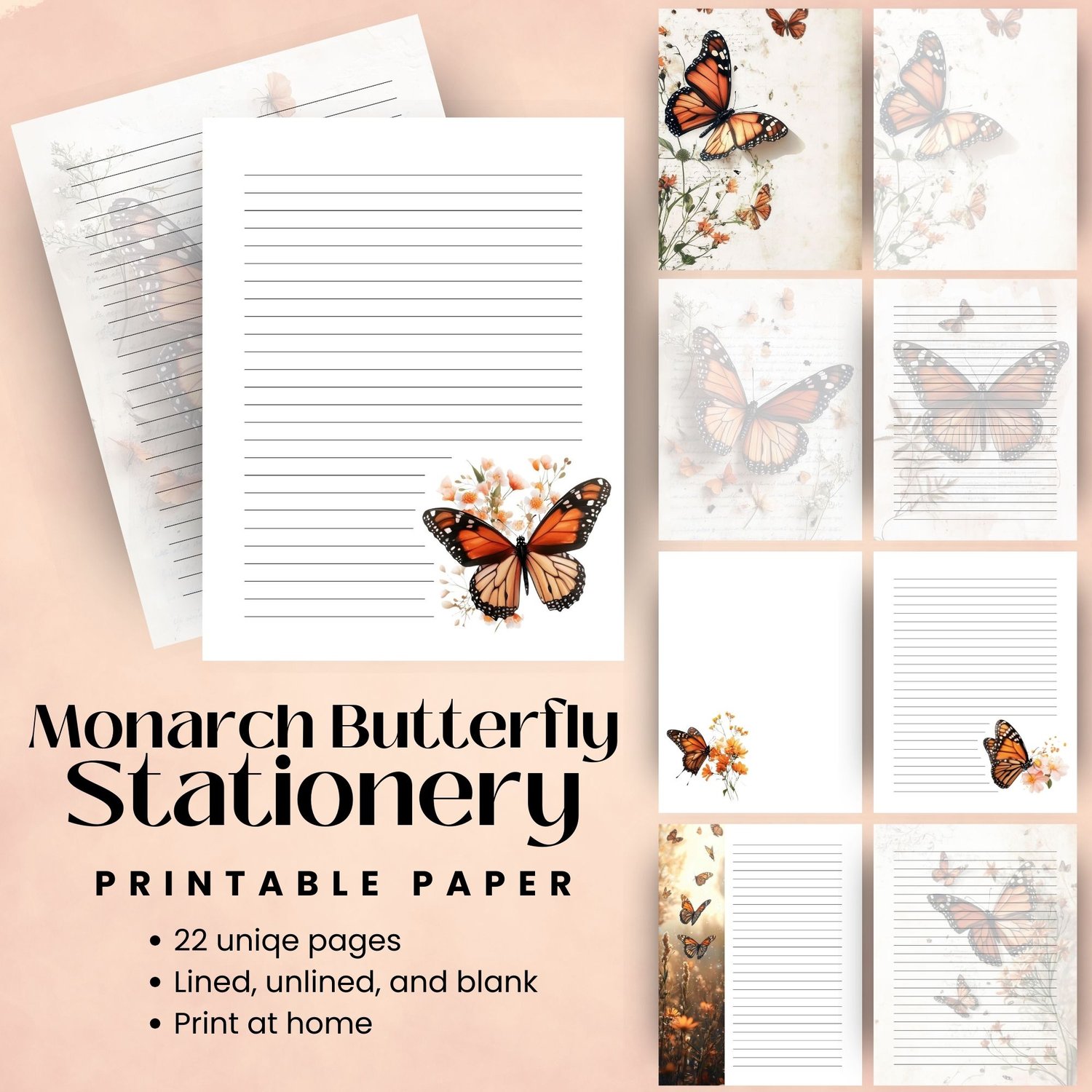 This Monarch Butterfly stationery set features 22 printable pages designed for letter writing, journaling, and creative self-expression. Each page includes soft vintage textures, botanical flourishes, and the iconic monarch butterfly—symbolizing transformation, growth, and beauty.