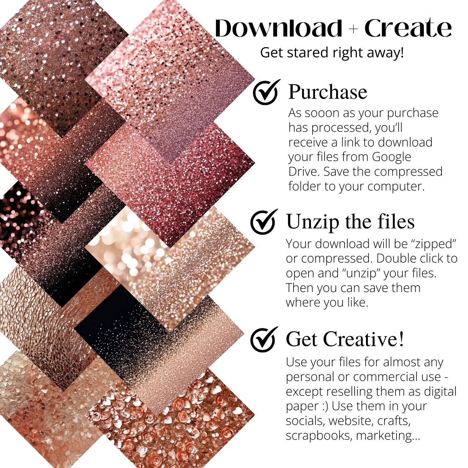 This glam digital paper collection is a must-have for designers, small business owners, and creative entrepreneurs. Whether you're crafting shimmering wedding invitations or need a luxury sparkle background, this rose gold digital paper set is the perfect choice. Download instantly and start creating!